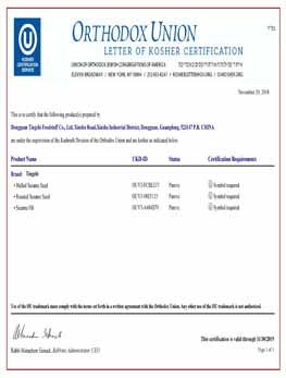 | 氣滋味 Smell and Taste | 具有濃郁的芝麻油固有香味和滋味,口感好,無異味 | 具有脫皮芝麻固有的氣滋味,口感香脆,無異味 | 具有精制白芝麻固有的氣滋味,口感香脆,無異味 | 具有精制黑芝麻固有的氣滋味,口感香脆,無異味 | 具有顯著的芝麻醬固有香味,無異味 |